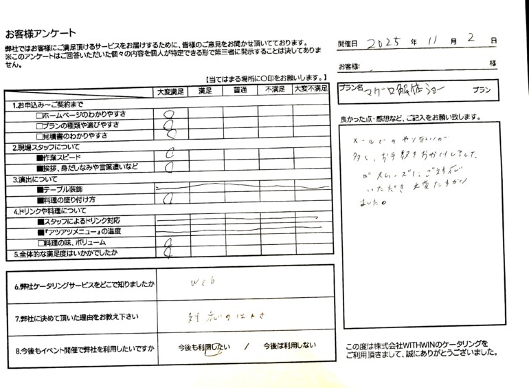 評価: 申し込みから現場スタッフの対応、お料理の味・ボリュームに至るまで、すべての項目で「大変満足」の評価をいただきました。