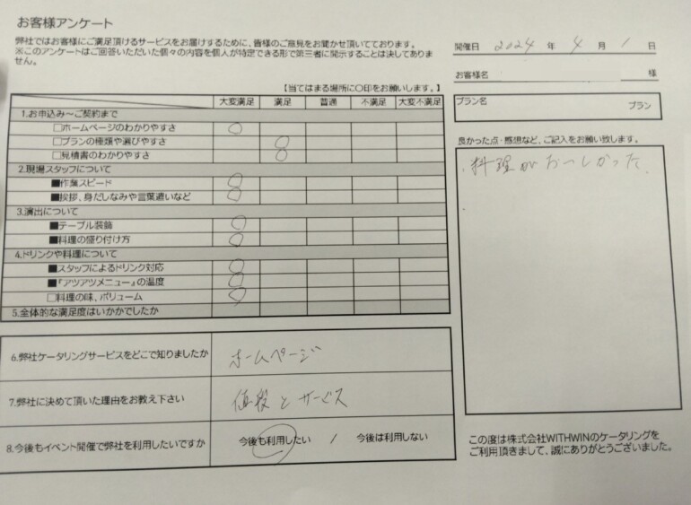 お客様からのメッセージ: アンケートには「料理がおいしかった」との温かいお言葉をいただき、チーム一同、大きな励みとなっております。